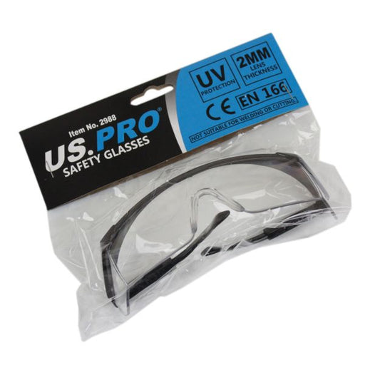 US PROClear lens with black frame and adjustable arms Lens thickness: 2.0mm UV Protection Comply to CE, EN166