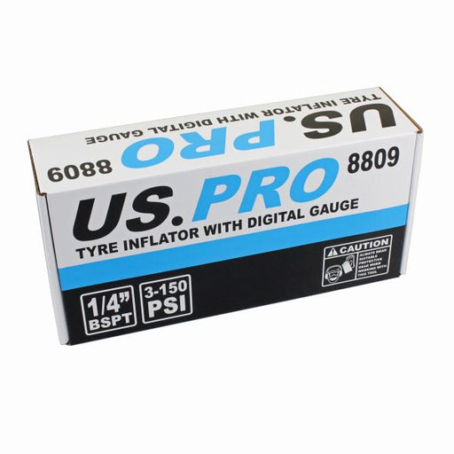 US PROTyre inflator with digital display gauge & compact tyre chuck. Range: 3 - 150 PSI 1/4" BSPT Supplied with a UK PCL Plug and Euro plug