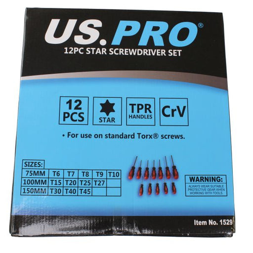 US PROA 12 piece Star screwdriver set for use with Torx® screws. Sizes: T6 x 75, T7 x 75, T8 x 75, T9 x 75, T10 x 75mm T15 x 100, T20 x 100, T25 x 100, ...