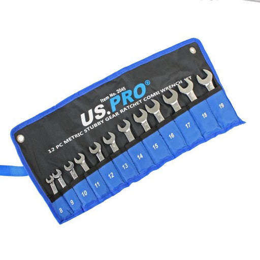 US PROSet of 12 stubby gear ratchet combination wrenches. Sizes: 8, 9, 10, 11, 12, 13, 14, 15, 16, 17, 18 and 19mm • Smooth 72 teeth ratchet action • Ha...