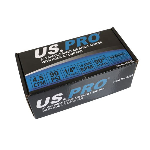 US PROVariable speed sander with hook and loop pad. Free Speed RPM: 15,000 Air Consumption CFM: 4.5 Pad mm: 75 Angle: 90 deg Length mm: 175 Air Pressure...
