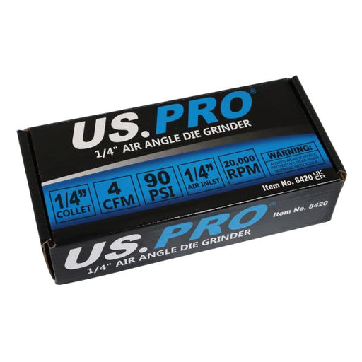 US PROAir angle die grinder. • Free Speed: 20,000 RPM • Avg Air Consumption: 4 CFM • Collet: 1/4" (6mm) • Air Pressure: 90 psi • Air Inlet: 1/4" BSPT • ...