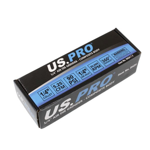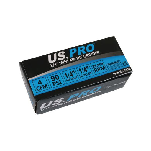 US PROMini air die grinder with 1/4" collet. • Free speed: 25,000 rpm • Collet: 1/4" (6mm) • Air inlet: 1/4" • Air Pressure: 90 psi • Air consumption: 4...