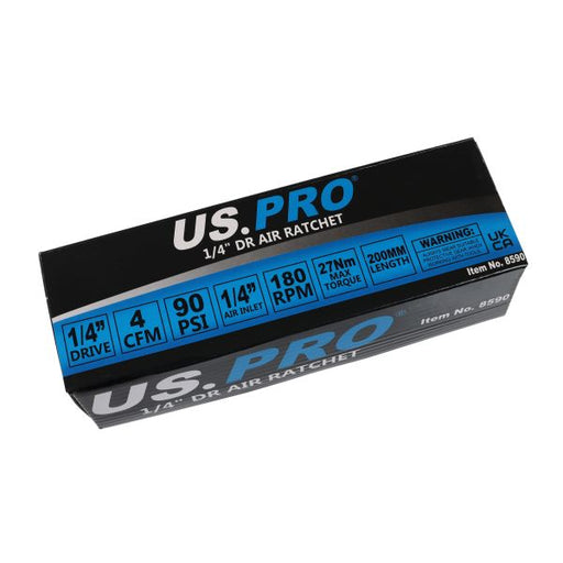 US PRO1/4" drive air ratchet. • Free Speed: 180 RPM • Max Torque N.m: 27 • Length mm: 200 • Air Consumption CFM: 4 • Weight Kg: 0.57 • Air Pressure: 90 ...